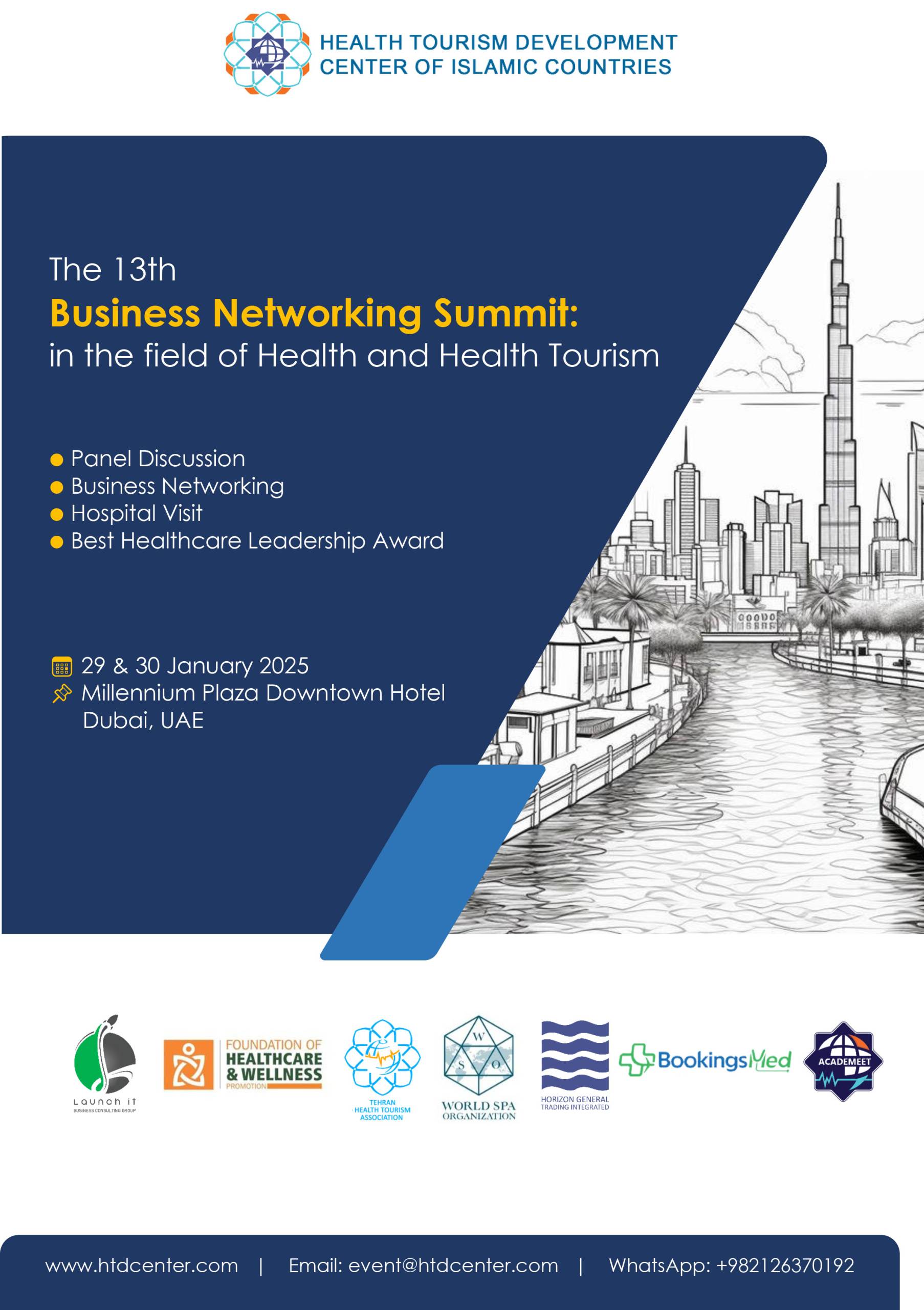 Health Tourism Development Center of Islamic Countries (HTDC) align with its missions and goals in networking between health and health tourism activists and players in different countries hosts “The 13th Business Networking summit in the field of Health & Health Tourism” from 29 to 30 January 2025 in Dubai in cooperation with international organizations and associations active in this field . The event includes speeches, panel discussion, hospital & clinics visits, award ceremony, and networking meetings, and aims to spotlight the UAE’s growing health and health tourism industry as well as showcasing its capacities and opportunities of investment to the related key international organizations and activists.